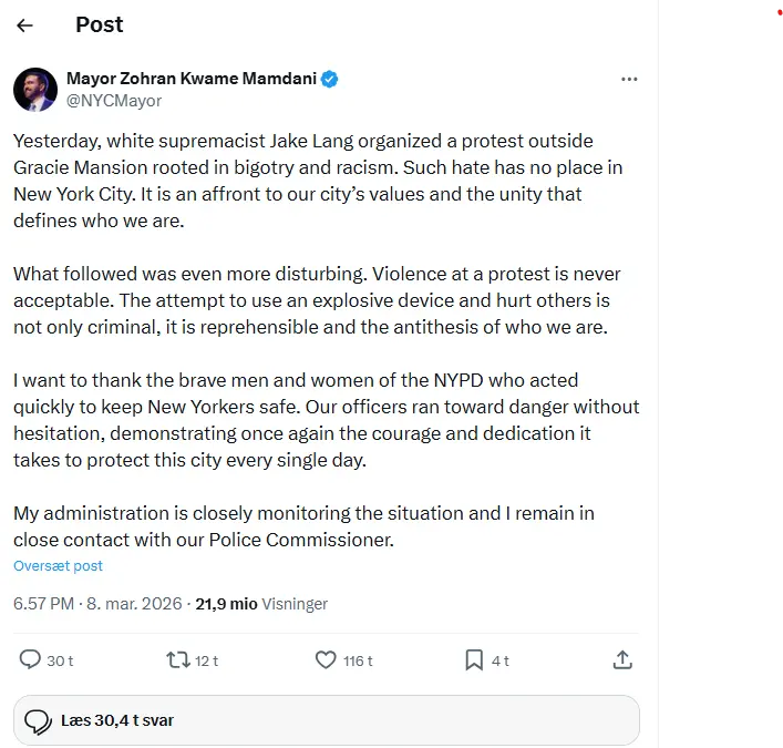 On March 8, the mayor condemned the events in a public statement. “Yesterday, white supremacist Jake Lang organized a protest outside Gracie Mansion rooted in bigotry and racism,” Mamdani said.