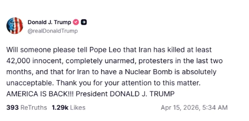 In his latest post, Trump wrote: “Can someone please tell Pope Leo that Iran has killed at least 42,000 innocent completely unarmed protesters over the past two months, and that it is completely unacceptable for Iran to have a nuclear bomb?”