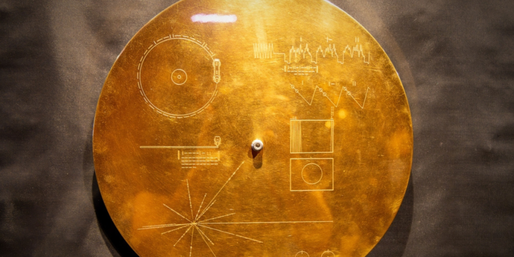 The spacecrafts holds a gold-plated phonograph record containing sounds and images of life on Earth — greetings in 55 languages, music from Bach to Chuck Berry, and the sound of a heartbeat.